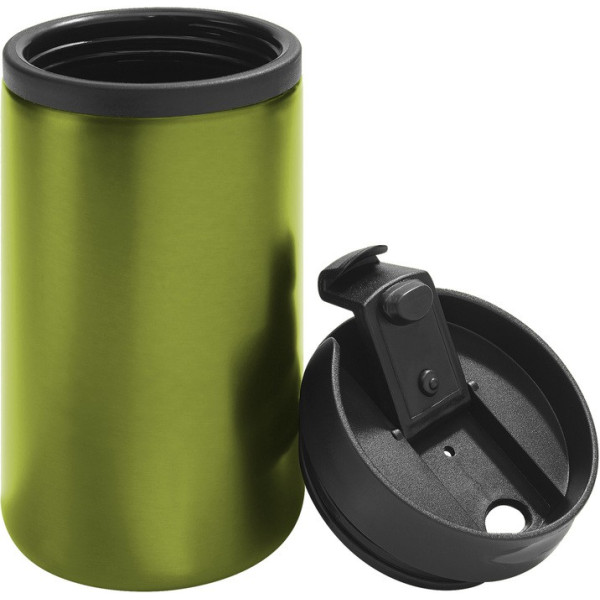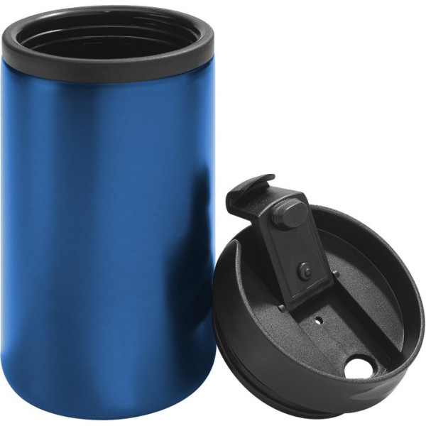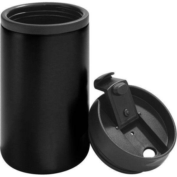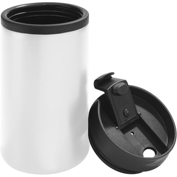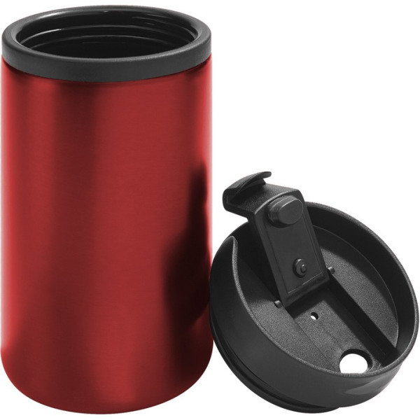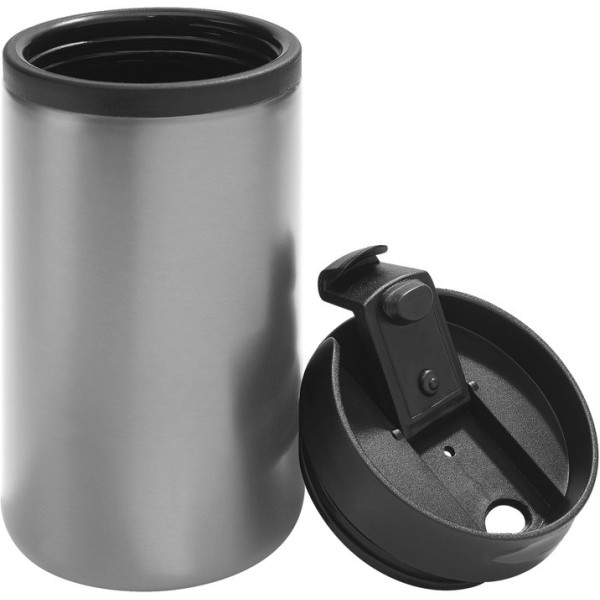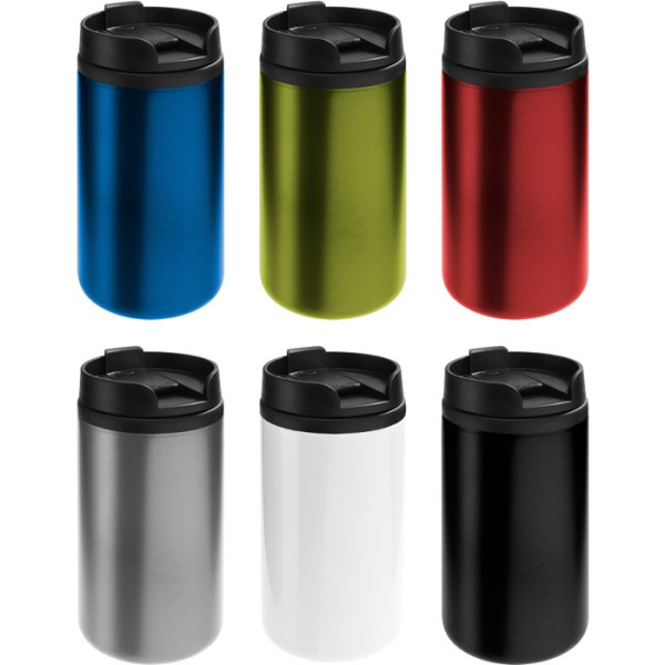 Mug térmico doble pared, exterior de acero inoxidable, interior de plástico, tapa rosca en plástico con apertura para beber.