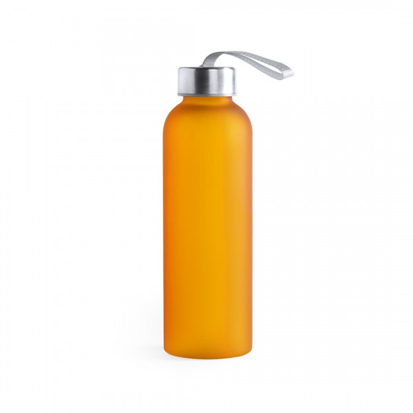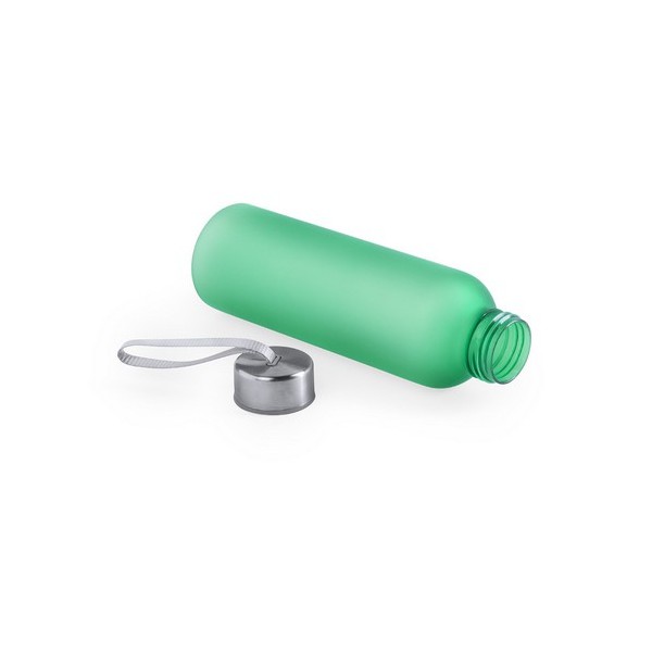 Botella o bidón en alta calidad y de gran capacidad -580ml-, con cuerpo en variada gama de colores translúcidos, tapón de seguridad a rosca en acero inox y resistente asa de transporte.