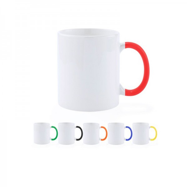 Taza de cerámica de 350ml de capacidad en divertida combinación de exterior e interior en color blanco con asa en variada gama de vivos colores.