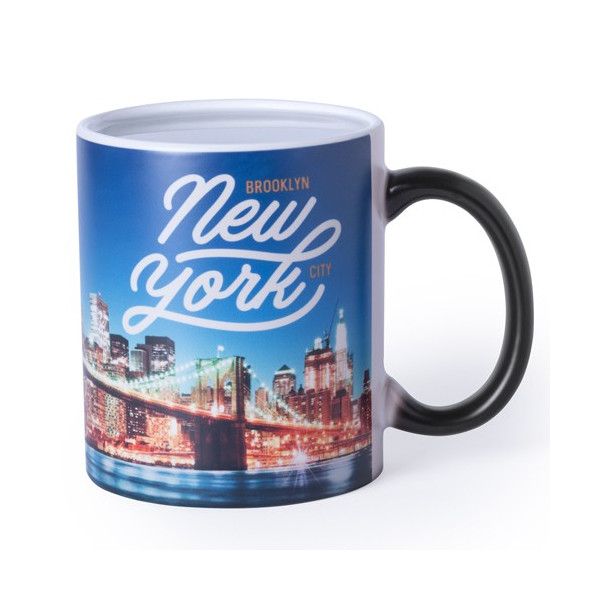 Taza de cerámica de 350ml de capacidad con exterior en color negro e interior en blanco.