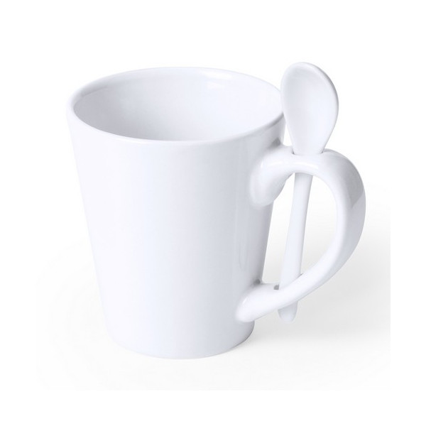 Taza de cerámica de 350ml en color blanco y cucharita de cerámica.