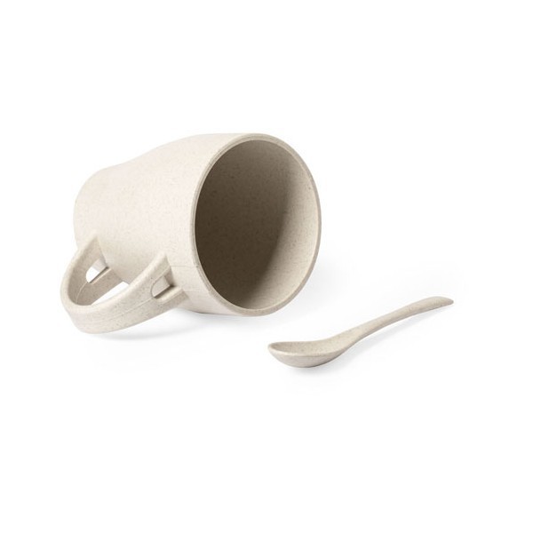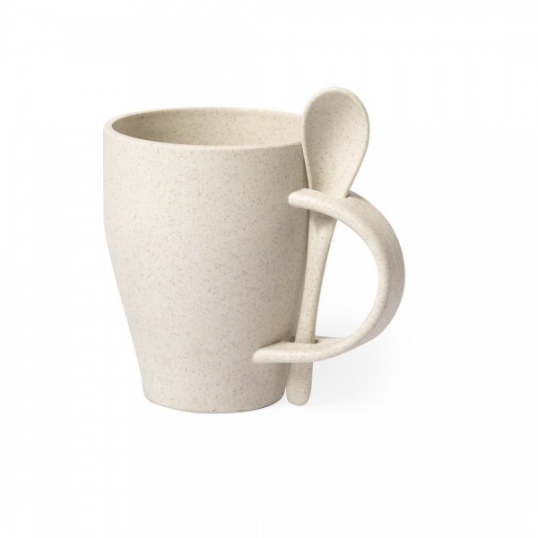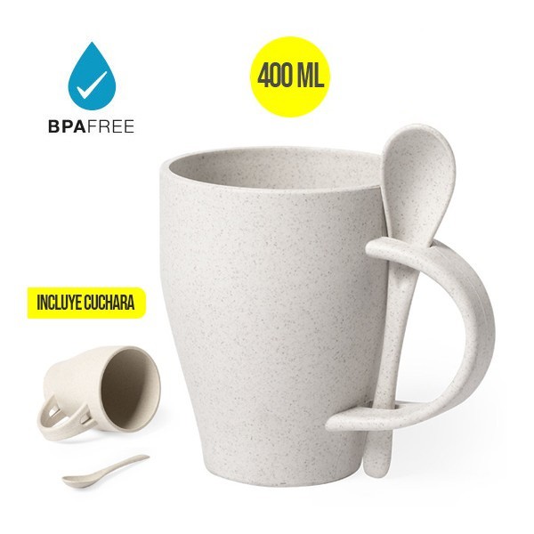 Fabricada en fibra de bamboo, con cuchara a juego integrada en asa.