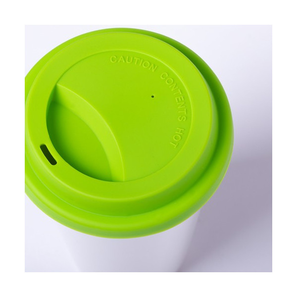 Vaso de cerámica de 400ml de capacidad original diseño bicolor, con vaso en color blanco y tapadera de silicona en variada gama de colores.