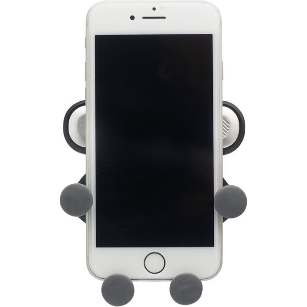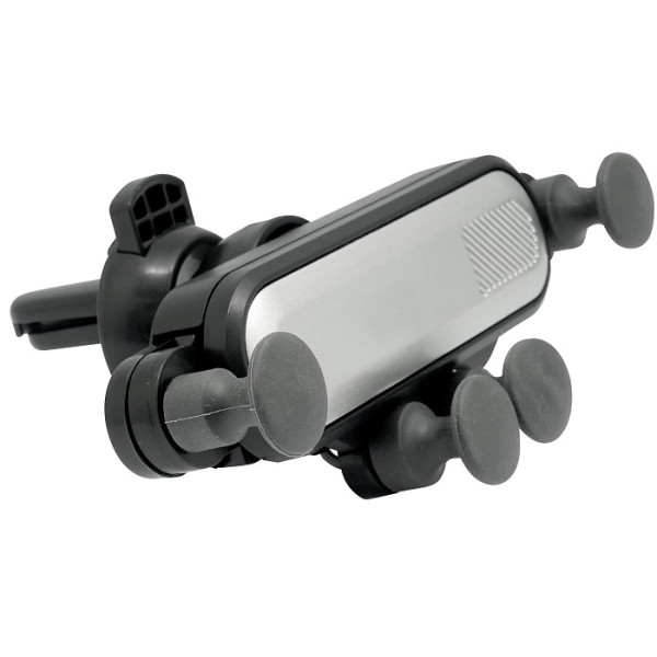 Ancho máximo de celular 8,6 cm, Plástico y silicona. Soport de celular, cuenta con un botón que permite engancharse en la rejilla del aire acondicionado del auto. Ajusta a 360°.