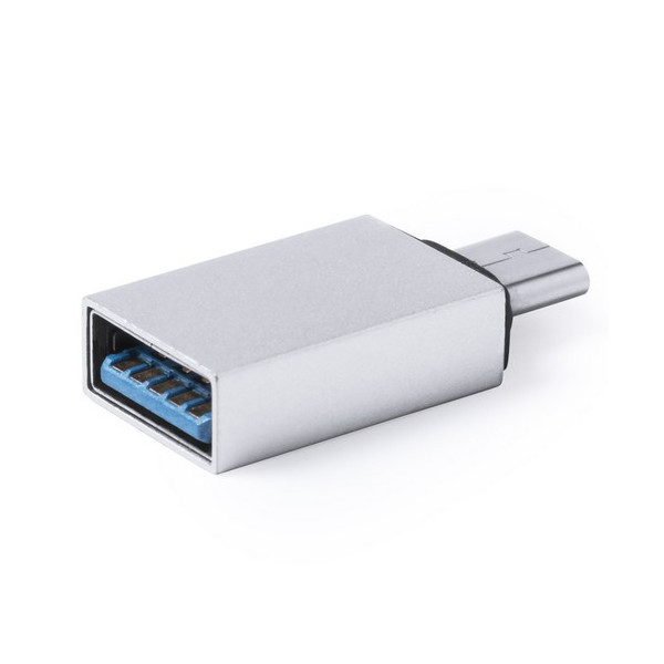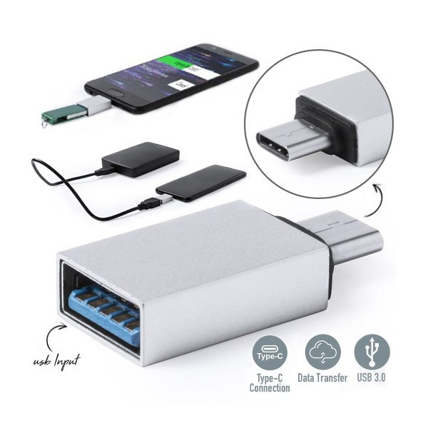 Adaptador de diseño minimalista y cuerpo en aluminio de USB a conexión Tipo-C. Conexión USB 3.0. Admite carga y conexión de datos.