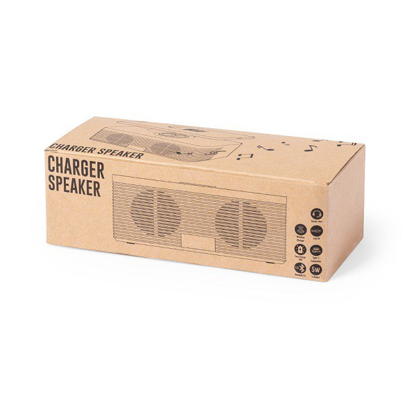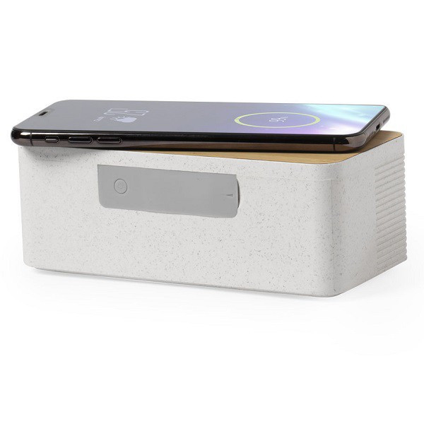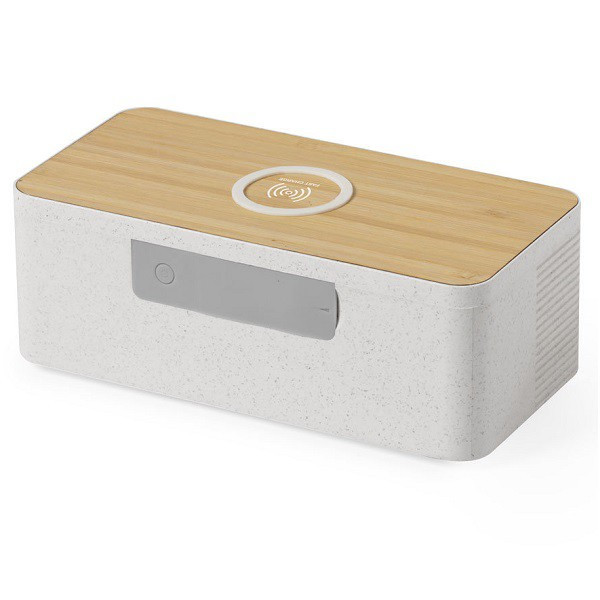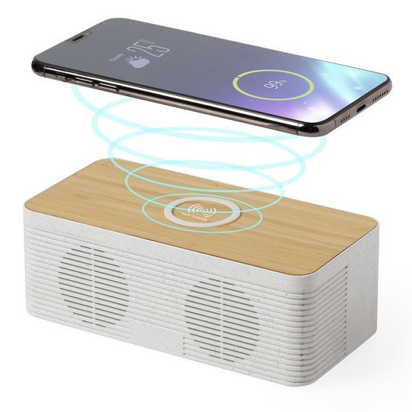 Parlante - Altavoz inalámbrico de línea ecológica, de carga rápida 10W. Conexión Bluetooth® 5.0, con 5W de potencia. superficie de carga hecha en bambú, con carcasa en caña de trigo.