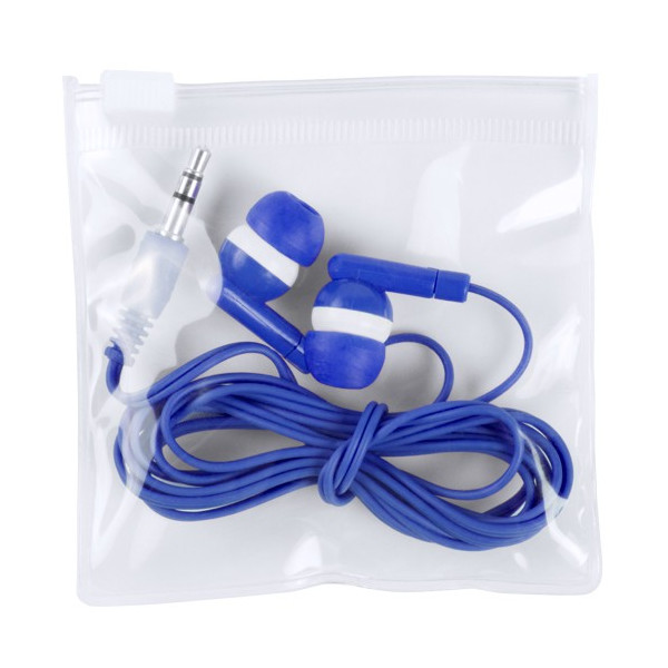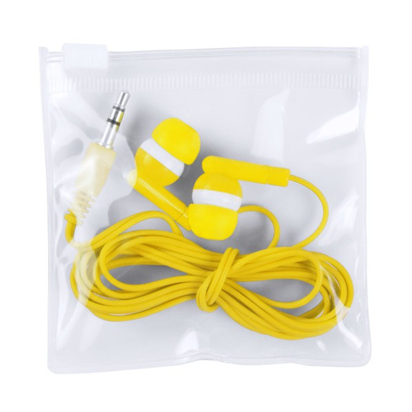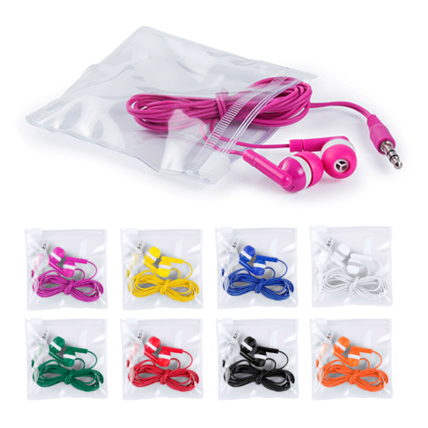 Prácticos y confortables auriculares intraurales de desenfadado diseño bicolor, conexión jack de 3,5mm y cable en color a juego. Presentados en bolsita transparente de PVC con autocierre.
