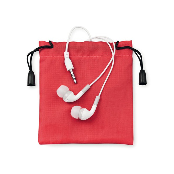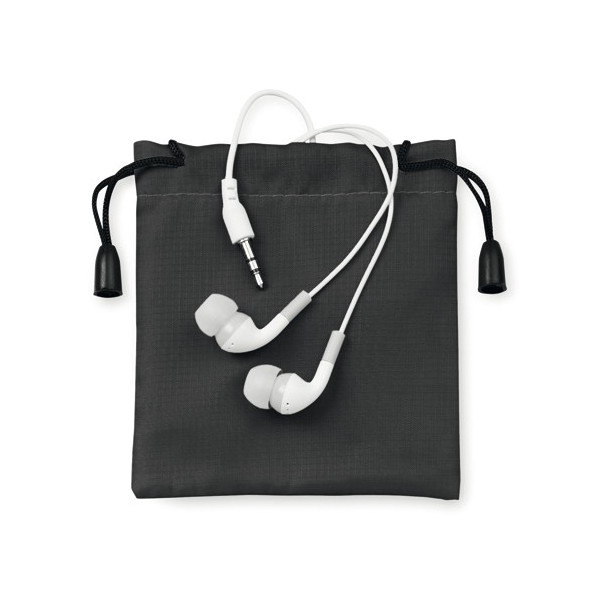 Prácticos y confortables auriculares intraurales de sobrio diseño, conexión jack de 3,5mm y cable en color blanco. Presentados en bolsita de tela de colores y con cordones autocierre.