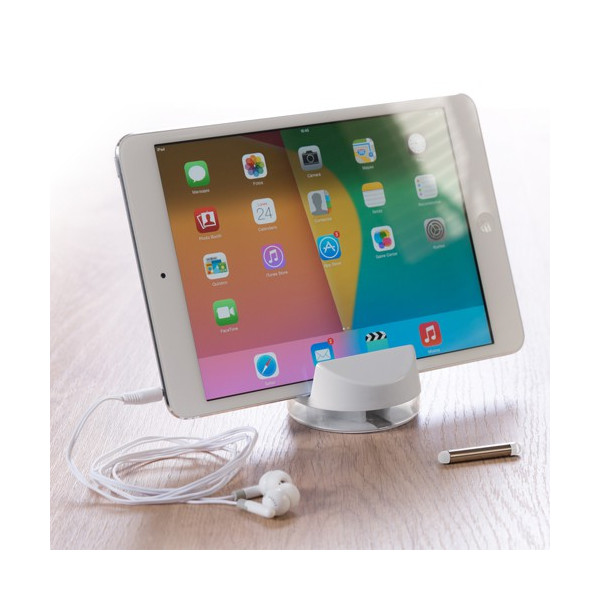 Set 3 en 1 de auriculares, soporte para dispositivo móvil y puntero de elegante diseño en color blanco, con cable a juego y presentados en una cajita individual.