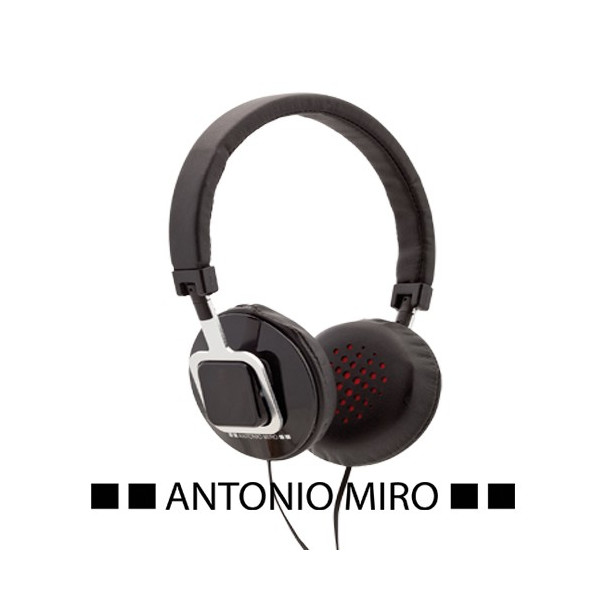 Auriculares de diadema de Antonio Miró de diseño minimalista con recubrimiento en suave polipiel de color negro y con cable a juego. Conexión jack de 3,5mm, almohadillas en polipiel y presentados en atractiva caja de diseño con el logotipo de la marca.