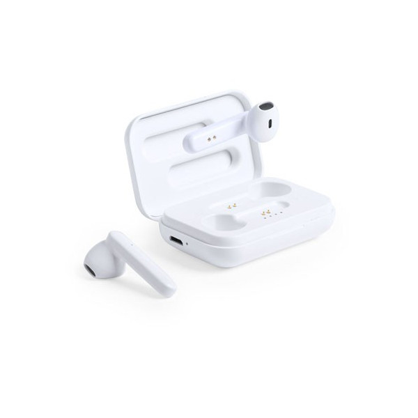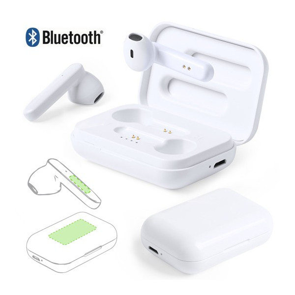 Auriculares intraurales en elegante acabado blanco y conexión Bluetooth 5.0. De diseño ergonómico, incluyen panel de control táctil integrado en el auricular, con base de carga a juego. Función manos libres y recargables, con cable micro USB incluido. Presentados en estuche individual de lujo con tapa de bisagra y en atractiva caja de diseño.