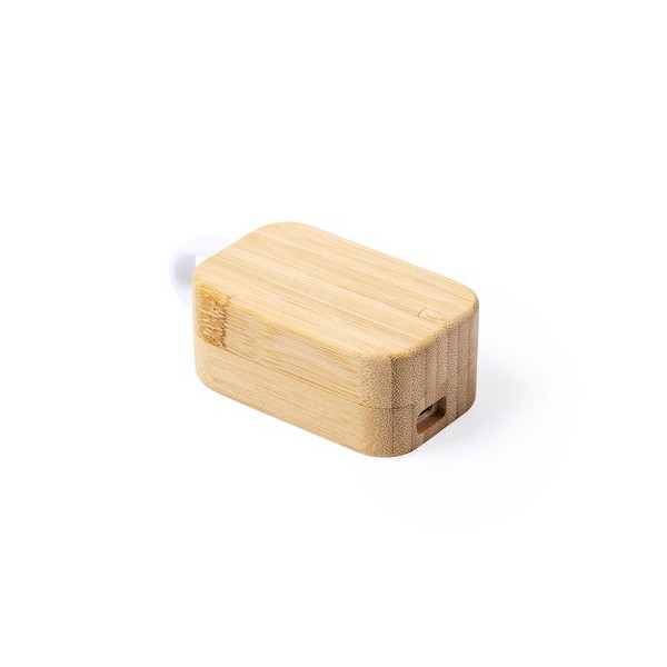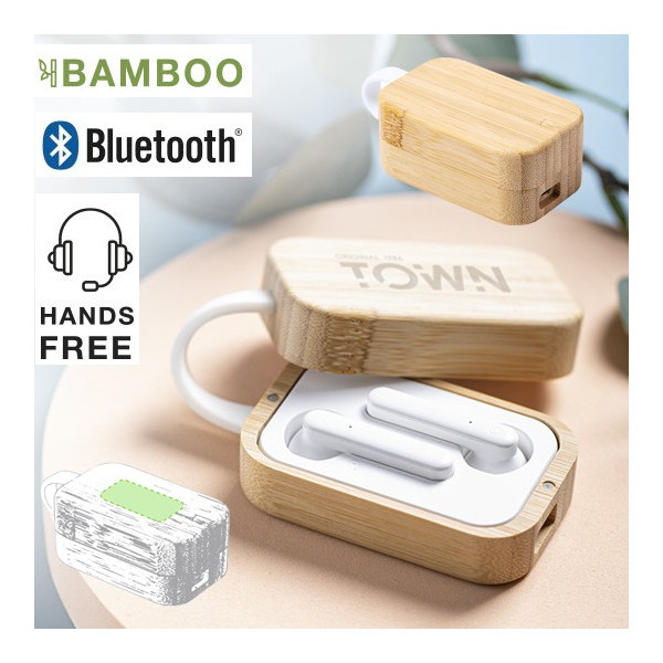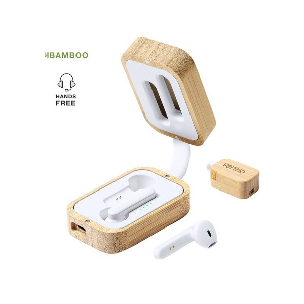 Auriculares intraurales de línea nature, con conexión Bluetooth® 5.0 y batería de litio. En elegante acabado de color blanco y presentados en estuche cargador de bambú. De diseño ergonómico, incluyen botón de control táctil integrado en el auricular, con base de carga a juego y luz LED de estado de carga. Función manos libres y recargables, con cable micro USB incluido. Presentados en atractiva caja de diseño eco.