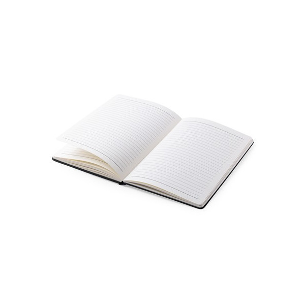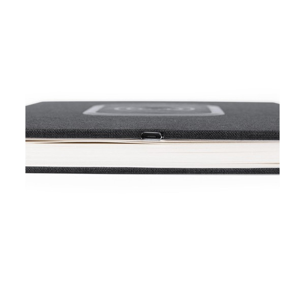 Bloc de notas cargador en resistente poliéster 300D con cargador inalámbrico integrado. De sobrio diseño y original estación de carga en la portada. Incluye 80 hojas con disposición a una raya.