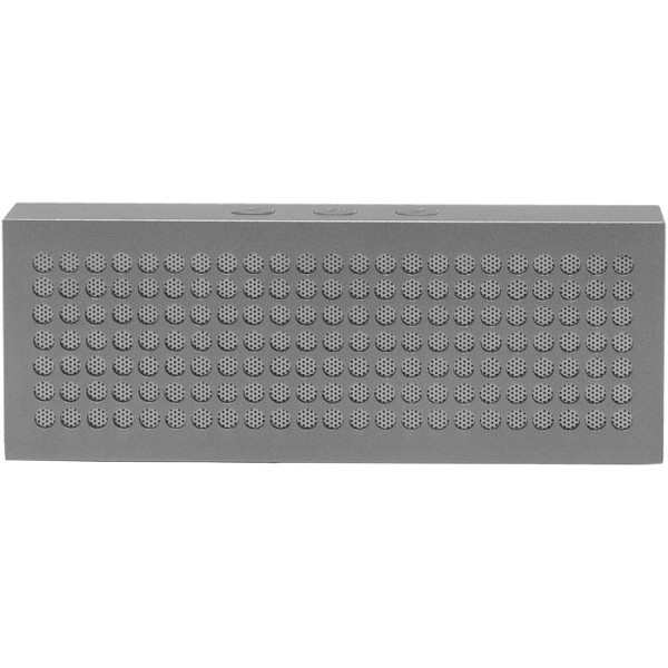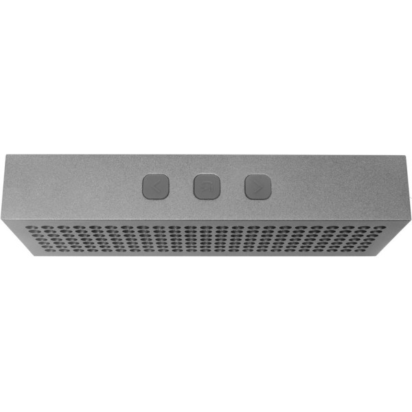 Metal. Parlante Bluetooth. Batería de litio. En la parte superior botones engomados para retroceder, pausar y adelantar. En el costado botón de encendido, USB y entrada plug. Base antideslizante. Autonomía a un volumen promedio de 50% 3 hs y alcance de transmisión 10 metros.