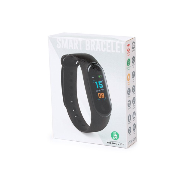Brazalete inteligente multifunción de diseño deportivo, con conexión Bluetooth 4.0 y recargable mediante conector micro USB integrado en la pulsera. Su cuerpo en material TPU y su pantalla a color TFT integrada de 0,96 pulgadas lo convierten en el gadget perfecto para todo tipo de actividades deportivas, de ocio y para el día a día. APP disponible para iOS y Android. Con monitorización de frecuencia cardíaca y multitud de funciones. Presentado en atractiva caja de diseño.