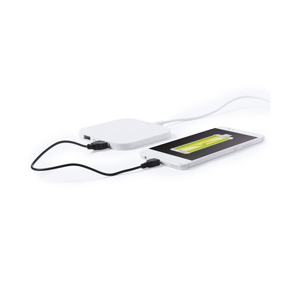 Cargador inalámbrico de diseño minimalista en color blanco. Con salida USB dual extra de 2.100 mA de capacidad para carga simultánea de dos dispositivos. Con base antideslizante. Compatible con dispositivos equipados con tecnología de carga inalámbrica y presentado en atractiva caja de diseño.