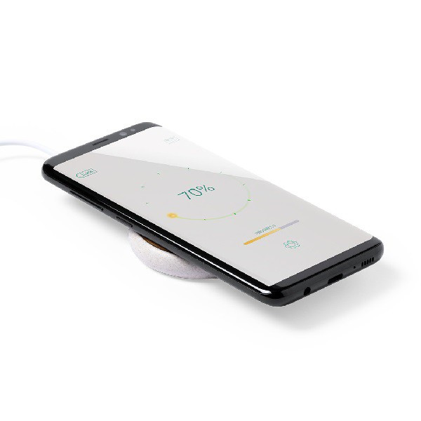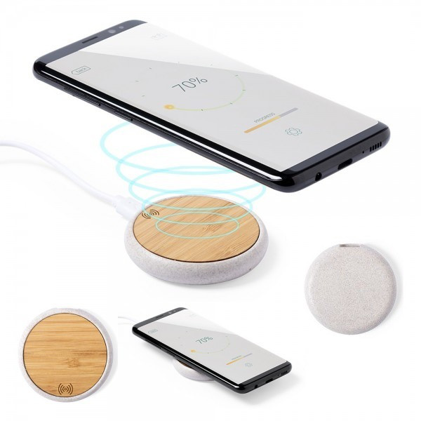 Cargador inalámbrico de diseño circular con superficie de carga en bambú y carcasa en caña de trigo, para así fomentar la utilización de materias primas naturales y reducir las emisiones contaminantes. Indicador led, con cable de carga micro USB incluido y compatible con dispositivos equipados con tecnología de carga inalámbrica.