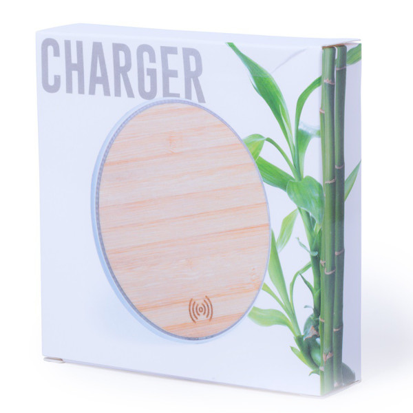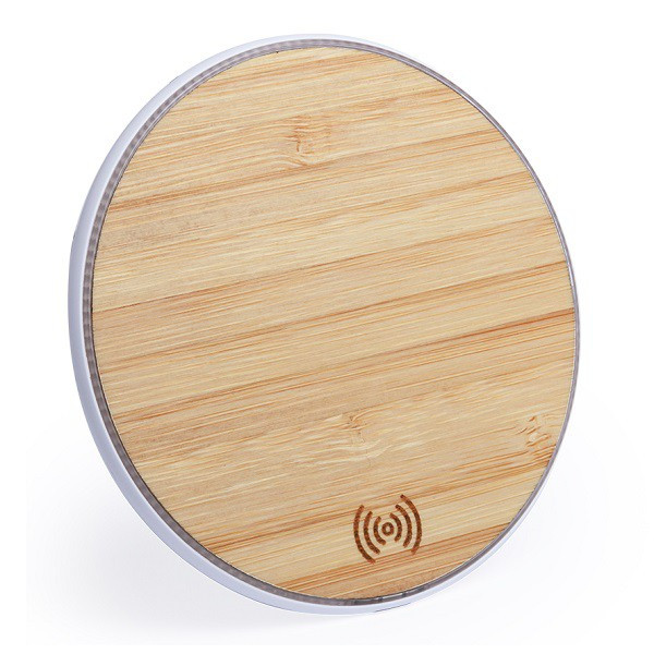 Cargador inalámbrico de línea ecológica, con base de carga en madera de bambú.