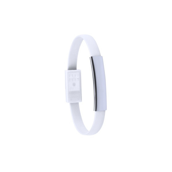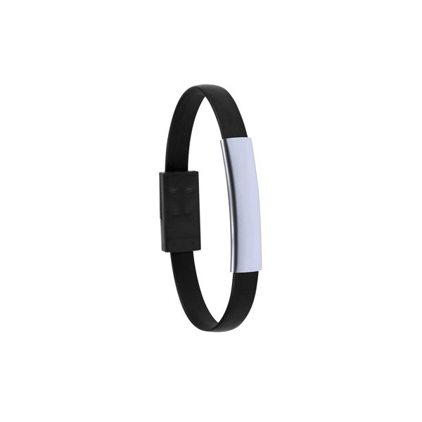 Pulsera-cable cargador en suave goma, con conexión Tipo-C y elegante pieza central de aluminio especialmente diseñada para marcaje en láser. Presentada en atractiva bolsa de diseño con autocierre.