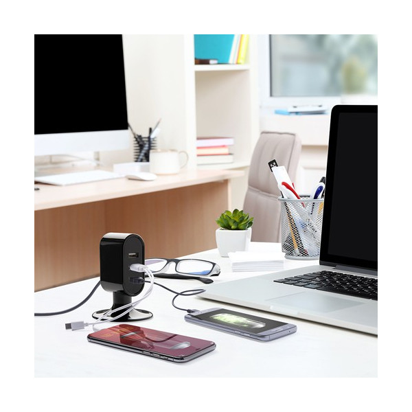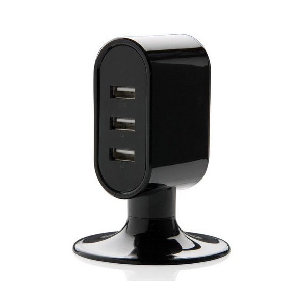 Cargador USB de escritorio con 3 salidas, de 3.100 mAh de capacidad de carga y en elegante diseño minimalista. presentado en caja individual.