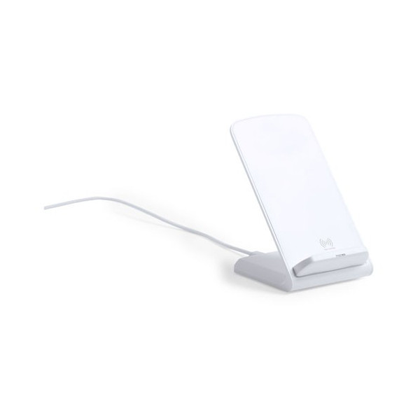 Cargador inalámbrico en elegante acabado blanco con función soporte para móvil. Función carga rápida de 10W y compatible con dispositivos equipados con tecnología de carga inalámbrica. Amplia superficie de marcaje y presentado en atractiva caja de diseño.