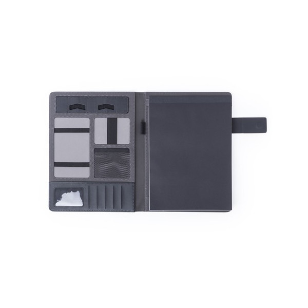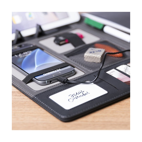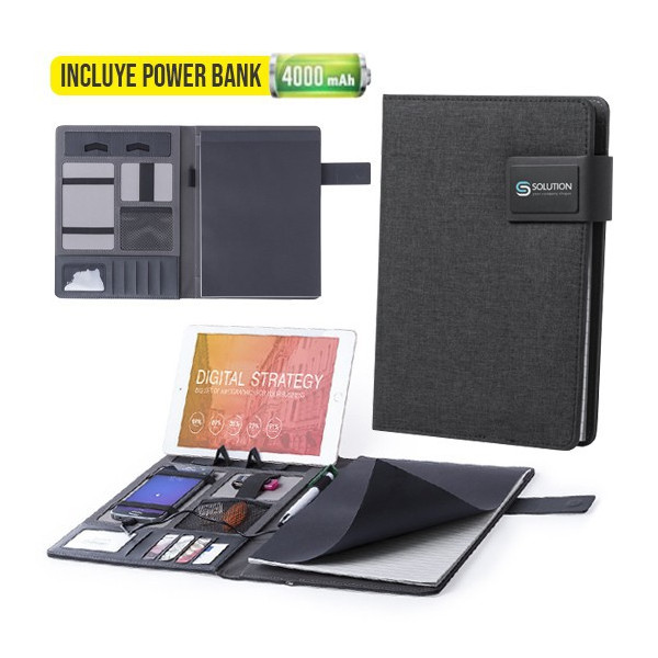 Carpeta en suave poliéster 300D de acabado grafito con batería de gran capacidad de carga -4.000 mAh- integrada. De sobrio diseño y cierre magnético, con placa metálica para marcaje. Multitud de compartimentos para almacenar tarjetas de visita y memorias USB, además de soportes para smartphone y tablets y LED indicadores de estado de carga en el interior. Incluye bloc de notas de 20 hojas tamaño A5. El fácil acceso a la estación de carga mediante cable micro USB -incluido- hacen de esta carpeta el gadget perfecto para el mundo de los negocios y los estudios.
