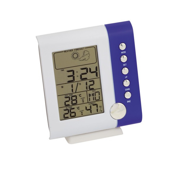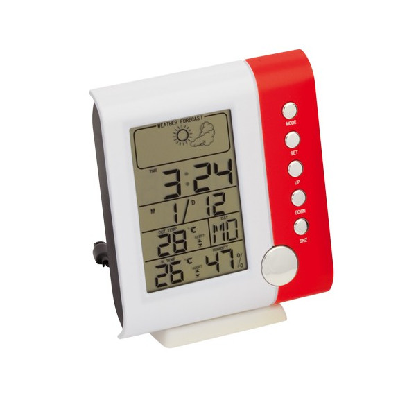 Estación meteorológica multifunción en acabado bicolor y con sensor de temperatura interior. Alimentación a pilas: tipo AAA no incluidas y presentada en caja individual.
