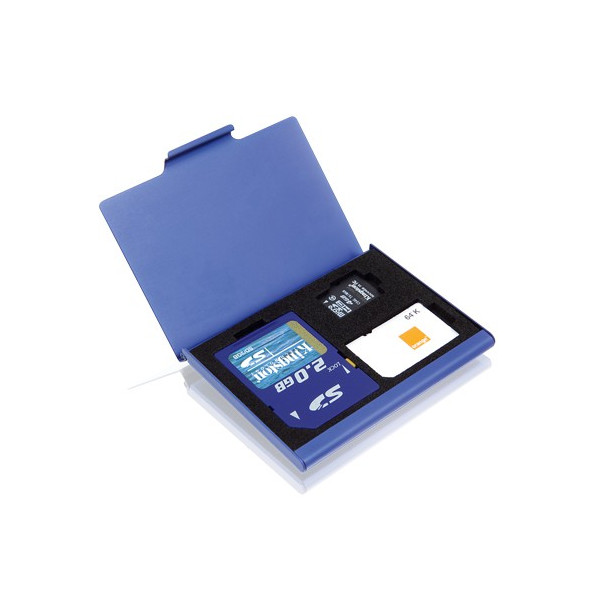 Práctico estuche organizador para tarjetas digitales. De acabado exterior en aluminio y suave esponja interior, puede almacenar tarjetas SIM, SD y Mini SD. Presentado en caja individual.