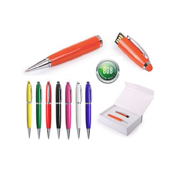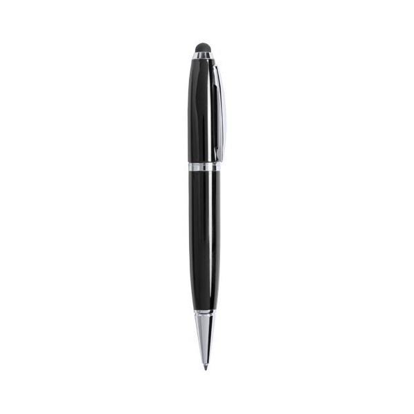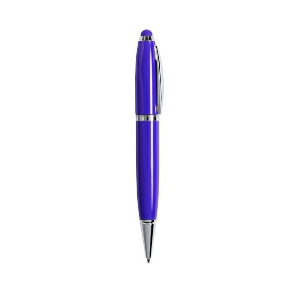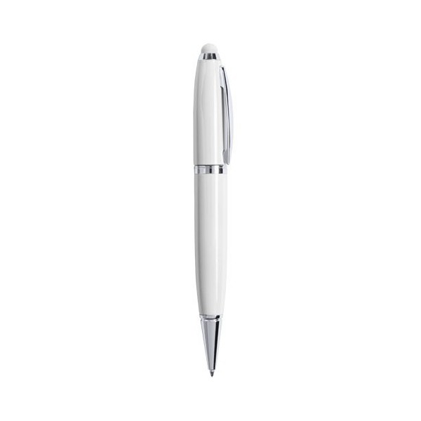 Bolígrafo tecnológico multifunción en desenfadados colores, con memoria USB de 8GB de capacidad integrada en la capucha y puntero de suave goma a juego.