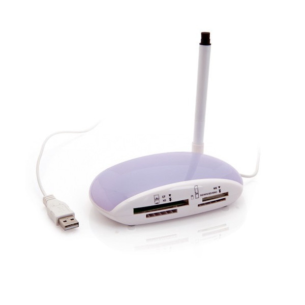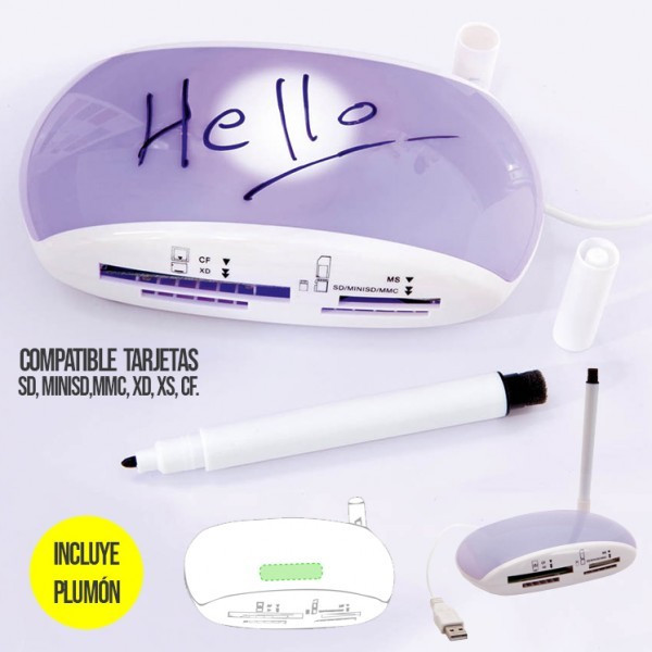 Original lector de tarjetas con original diseño curvado bicolor y tapa superior translúcida retroiluminada. Con rotulador para escribir mensajes en la parte retroiluminada y compatible con tarjetas SD, MiniSD,mmC, XD, XS, CF. Presentado en caja individual negra.