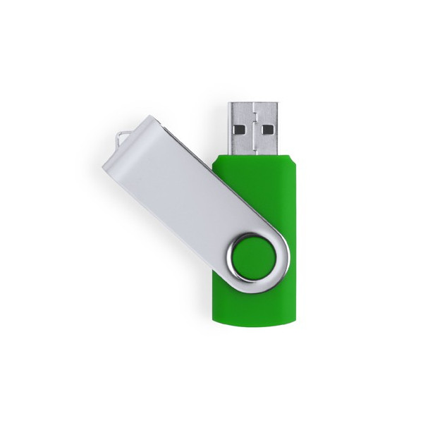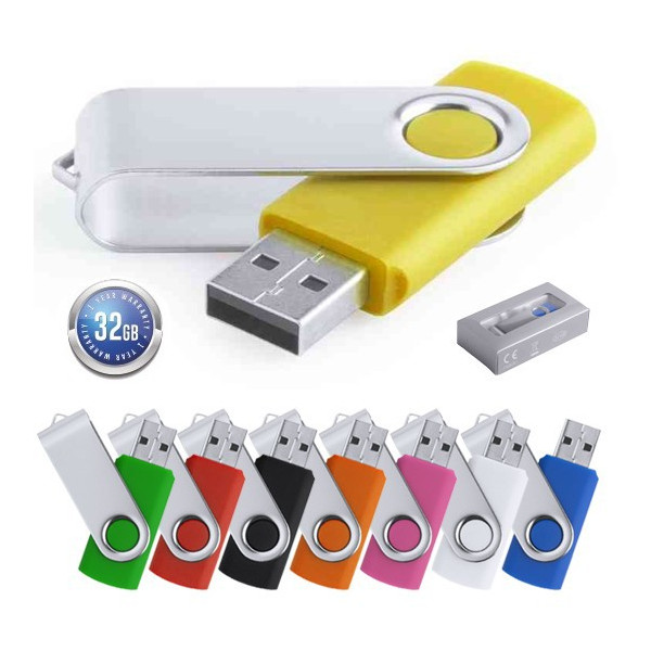 Memoria USB de 32GB de capacidad, con mecanismo giratorio, cuerpo de suave acabado y clip metálico. Presentada en estuche individual.