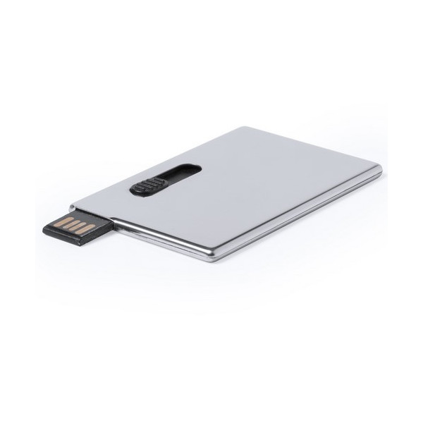 Memoria USB tarjeta de 8GB de capacidad. De diseño ultraplano, mecanismo retráctil y en acabado metálico brillante. Presentada en elegante estuche individual de cartón y suave espuma troquelada.