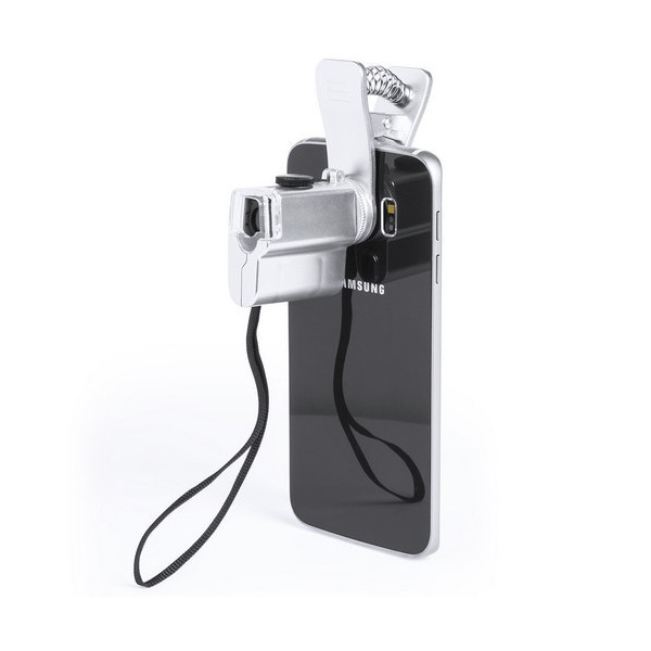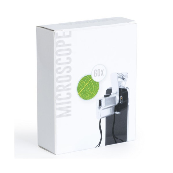 Microscopio para smartphone ajustable a la cámara mediante pinza. Con lentes de aumento de hasta 60x y luz led. Pilas de botón incluidas. Presentado en bolsita individual y en una atractiva caja de presentación de diseño.