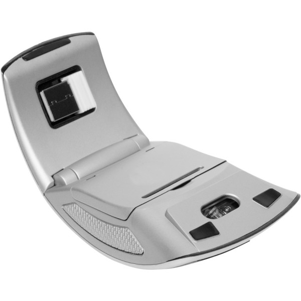 Plástico engomado. Mouse óptico inalámbrico. Conector USB que va a la computadora. Compartimento imantado en la base para guardar el conector USB. Estructura plegable para guardar cuando no está en uso. Funciona con dos pilas AAA (no incluidas)