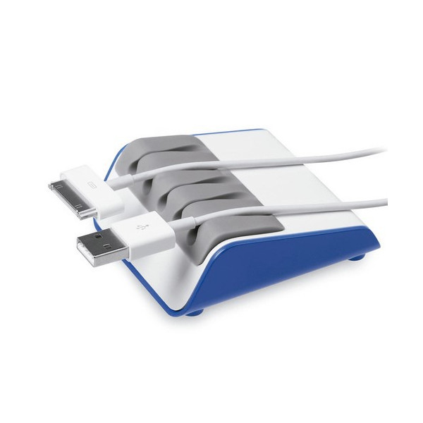 Práctico y resistanto organizador de cables en diseño bicolor, con soporte para 5 cables en suave goma y con base antideslizante.