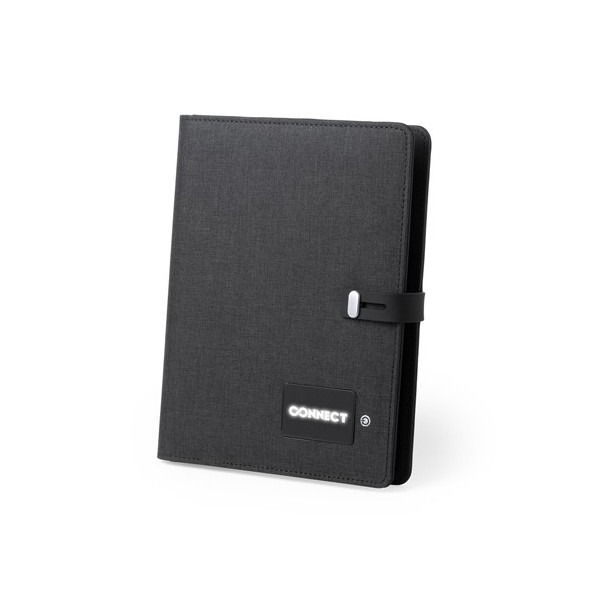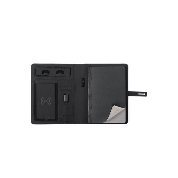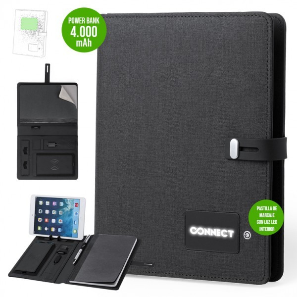 Elegante y práctico organizador en poliéster 300D. Con carga inalámbrica y batería auxiliar de 4.000 mAh de capacidad de carga integrada. Pastilla de marcaje con luz led interior y un recubrimiento exterior especialmente diseñado para marcaje en láser, con el que conseguirá que su publicidad o marca quede iluminada con luz blanca. De sobrio diseño y original cierre, incluye bloc de notas de 64 hojas, soporte para Bolígrafo - Lápiz e indicador led de estado de carga. El fácil acceso a la estación de carga mediante cable micro USB -incluido- hacen de este organizador el gadget perfecto para el mundo de los negocios. Las capacidades mostradas en todas nuestras baterías auxiliares externas son reales, incorporando todas ellas baterías de grado A y no recicladas, con una vida útil de al menos 500 ciclos de carga y según normativa CE. Además, están fabricadas conforme a los estándares RoHS y en cumplimiento con los siguientes requisitos de seguridad: Sistema de protección contra sobrecarga del power bank. Sistema de protección contra descarga completa que proporciona una mayor durabilidad del power bank. Sistema de bloqueo para evitar cortocircuitos. Sistema de transferencia de carga constante, acorde con la capacidad del dispositivo de destino.