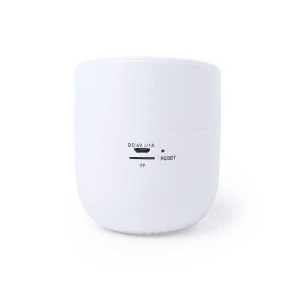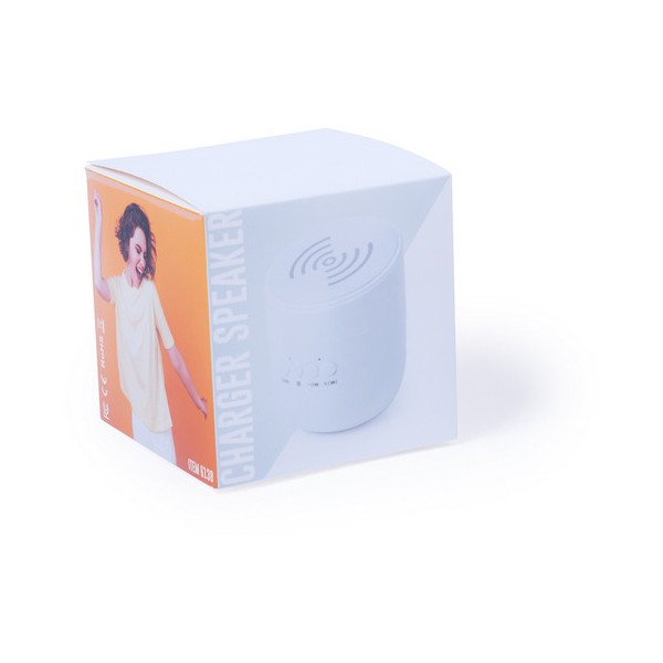 Altavoz con cargador inalámbrico integrado, de diseño compacto en elegante color blanco. Conexión Bluetooth, batería de litio y 3W de potencia. Función manos libres, con ranura para tarjeta micro SD, base antideslizante y recargable mediante cable USB -incluido-. Presentado en una atractiva caja de diseño.