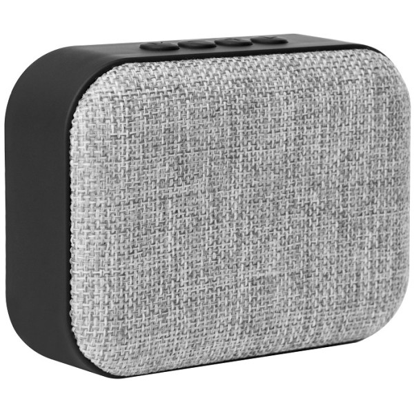 Plástico engomado y tela. Parlante bluetooth. En la parte superior tiene botones de Modo, volumen y Play. Con el botón Modo se elige entre las opciones de Bluetooth y USB. Opción de responder llamadas desde el parlante pulsando una vez el botón Play cuando entra la llamada. En la base detalles antideslizantes. Alcance de transmisión hasta 10 mts. Voltaje DC 5V. Incluye cable USB para carga.