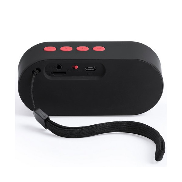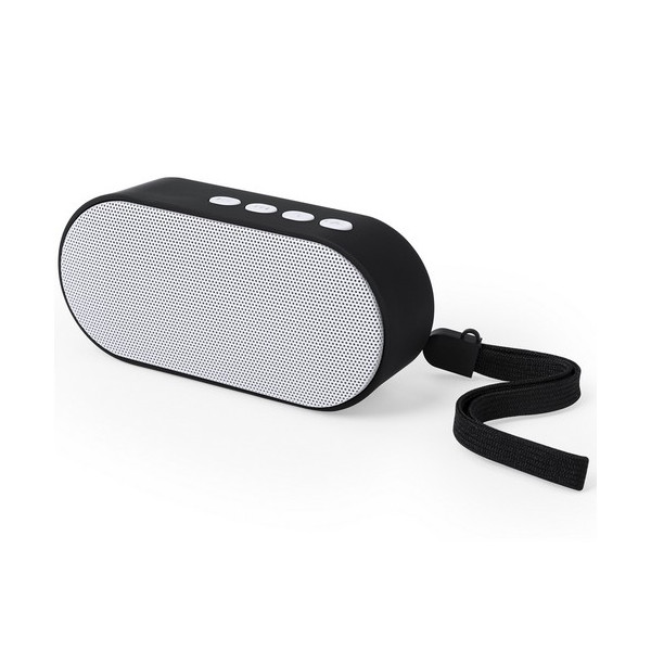Compacto altavoz de conexión Bluetooth. De diseño bicolor desenfadado y suave acabado, con conexión Bluetooth 3.0, ofrece 3W de potencia, tiene función de manos libres, una ranura para tarjetas mini SD de hasta 32 GB de capacidad, función radio FM, entrada auxiliar de línea mediante conexión jack de 3,5mm y soportes de goma antideslizantes en la base. Con asa de transporte y compatible con iOS y Android, incluye cable de carga mini USB, cable auxiliar jack de 3,5mm y viene presentado en atractiva caja de diseño.