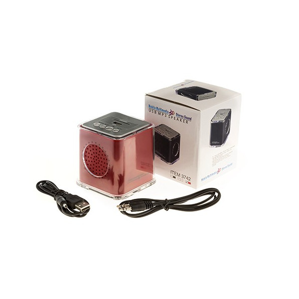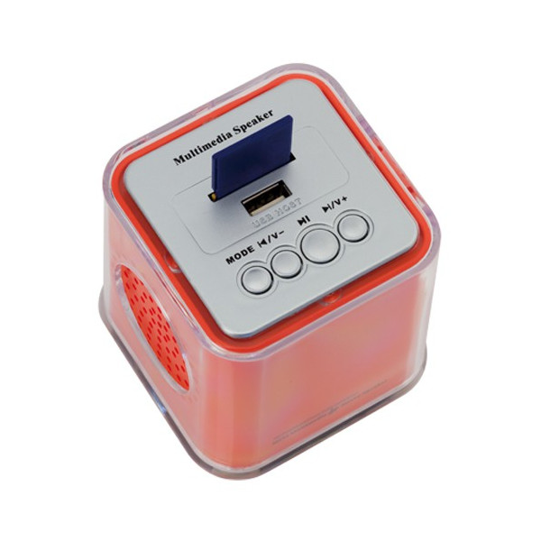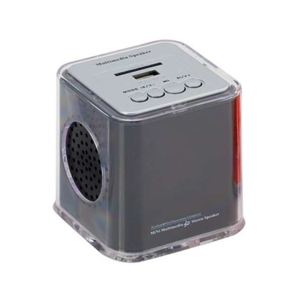 Mini reproductor de música de diseño minimalista con altavoz integrado y carcasa transparente. Ofrece 3W de potencia e incluye ranura para tarjetas SD. Recargable por cable mini USB -incluido- y presentado en atractiva caja de diseño.