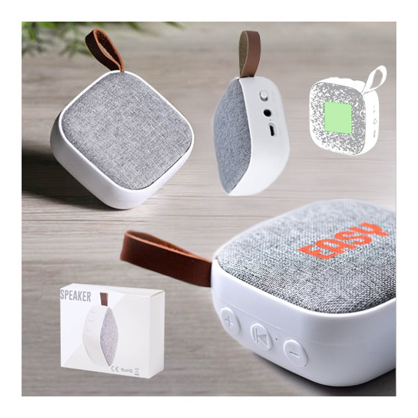 Altavoz de conexión Bluetooth de diseño bicolor, con rejilla de poliéster y asa de transporte en polipiel. Con conexión Bluetooth 5.0, ofrece 3W de potencia, tiene función de manos libres y función radio FM. Entrada auxiliar de línea mediante conexión jack de 3,5mm. Compatible con iOS y Android, incluye cable de carga micro USB. Presentado en atractiva caja de diseño.