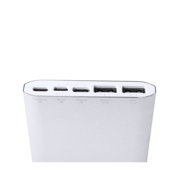 Batería auxiliar externa de gran capacidad de carga -10.000 mAh- con cuerpo acabado en resistente aluminio. Con salida USB dual para cargar dos dispositivos simultáneamente y 3 conexiones para entrada de corriente: lightning, micro USB y Tipo-C. Ledes indicadores de estado de carga, diseño curvado extraplano y amplia superficie de marcaje, especialmente recomendada para láser. Presentada en atractiva caja de diseño. Las capacidades mostradas en todas nuestras baterías auxiliares externas son reales, incorporando todas ellas baterías de grado A y no recicladas, con una vida útil de al menos 500 ciclos de carga y según normativa CE. Además, están fabricadas conforme a los estándares RoHS y en cumplimiento con los siguientes requisitos de seguridad: Sistema de protección contra sobrecarga del power bank. Sistema de protección contra descarga completa que proporciona una mayor durabilidad del power bank. Sistema de bloqueo para evitar cortocircuitos. Sistema de transferencia de carga constante, acorde con la capacidad del dispositivo de destino.