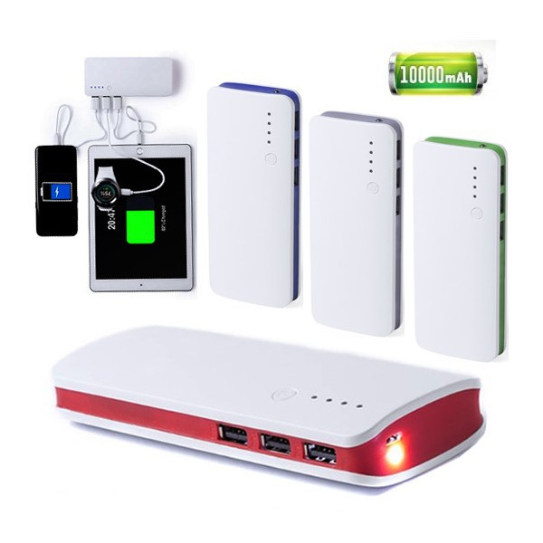 Batería auxiliar externa de gran capacidad de carga -10.000 mAh-. Con salida USB triple para cargar hasta 3 dispositivos de forma simultánea, ledes indicadores de estado de carga, diseño curvado con cuerpo en color blanco y laterales en vivos colores, con amplia superficie de marcaje. Presentada en atractiva caja de diseño. Las capacidades mostradas en todas nuestras baterías auxiliares externas son reales, incorporando todas ellas baterías de grado A y no recicladas, con una vida útil de al menos 500 ciclos de carga y según normativa CE. Además, están fabricadas conforme a los estándares RoHS y en cumplimiento con los siguientes requisitos de seguridad: Sistema de protección contra sobrecarga del power bank. Sistema de protección contra descarga completa que proporciona una mayor durabilidad del power bank. Sistema de bloqueo para evitar cortocircuitos. Sistema de transferencia de carga constante, acorde con la capacidad del dispositivo de destino.