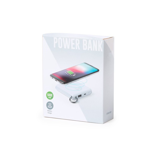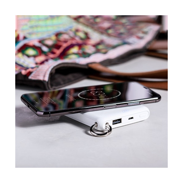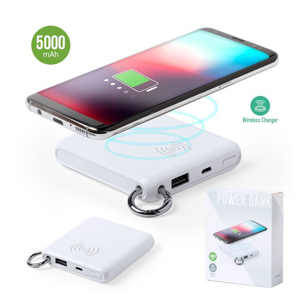 Batería auxiliar externa con cargador inalámbrico integrado. De sobrio diseño monocolor en blanco y 5.000 mAh de capacidad de carga, con anilla de transporte incluida. Salida USB, con cable de carga micro USB incluido. Compatible con dispositivos equipados con tecnología de carga inalámbrica. Presentado en atractiva caja de diseño. Las capacidades mostradas en todas nuestras baterías auxiliares externas son reales, incorporando todas ellas baterías de grado A y no recicladas, con una vida útil de al menos 500 ciclos de carga y según normativa CE. Además, están fabricadas conforme a los estándares RoHS y en cumplimiento con los siguientes requisitos de seguridad: Sistema de protección contra sobrecarga del power bank. Sistema de protección contra descarga completa que proporciona una mayor durabilidad del power bank. Sistema de bloqueo para evitar cortocircuitos. Sistema de transferencia de carga constante, acorde con la capacidad del dispositivo de destino.