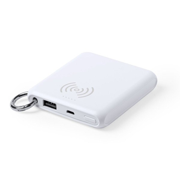 Batería de -5.000 mAh- con cargador inalámbrico integrado y diseño monocolor en blanco.