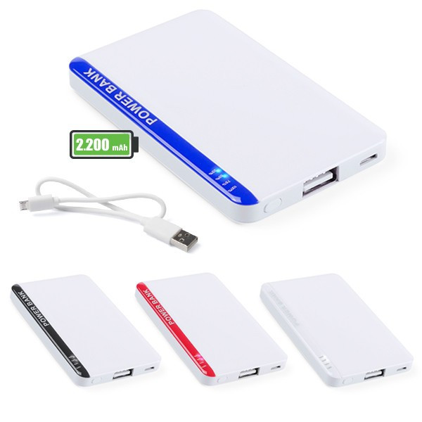 Batería auxiliar externa bicolor extraplana de 2.200 mAh de capacidad de carga con cable micro USB y ledes indicadores de estado de carga. Amplia superficie de marcaje y presentada en atractiva caja de diseño. Las capacidades mostradas en todas nuestras baterías auxiliares externas son reales, incorporando todas ellas baterías de grado A y no recicladas, con una vida útil de al menos 500 ciclos de carga y según normativa CE. Además, están fabricadas conforme a los estándares RoHS y en cumplimiento con los siguientes requisitos de seguridad: Sistema de protección contra sobrecarga del power bank. Sistema de protección contra descarga completa que proporciona una mayor durabilidad del power bank. Sistema de bloqueo para evitar cortocircuitos. Sistema de transferencia de carga constante, acorde con la capacidad del dispositivo de destino.