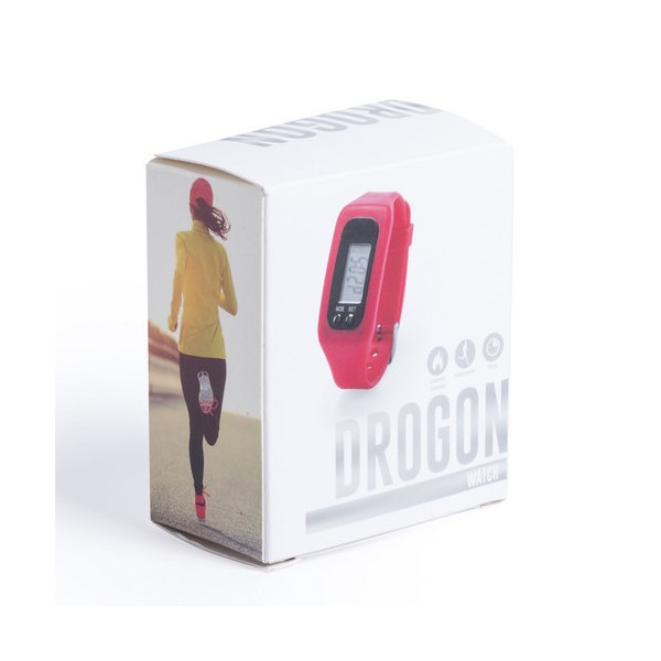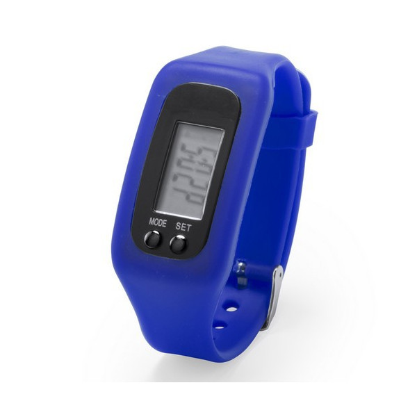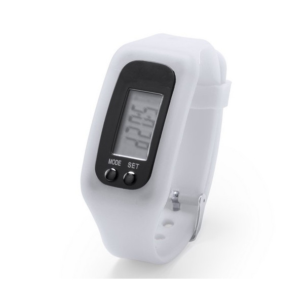 Desenfadado reloj digital de corte deportivo con pantalla LCD rectangular, correa ajustable de silicona y resistente a las salpicaduras de agua. Indicado para todo tipo de actividades deportivas y de ocio. Con pila de botón incluida y presentado en atractiva caja de diseño.