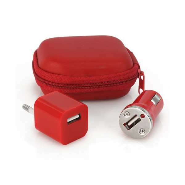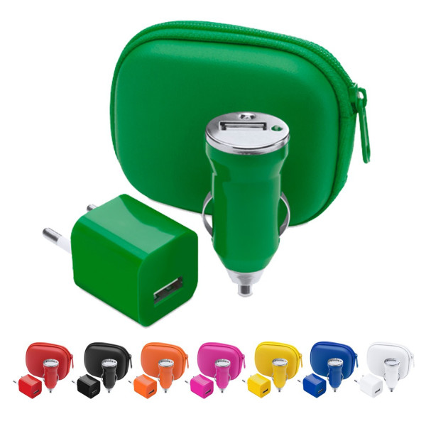 Set de cargadores USB para coche, con LED indicador de carga, y pared, de 1.000 mA de capacidad de carga y en divertidos colores. Presentados en desenfadado y resistente estuche de polipiel a juego.