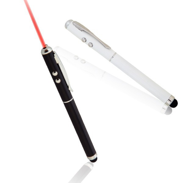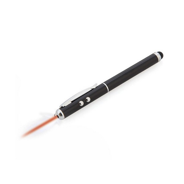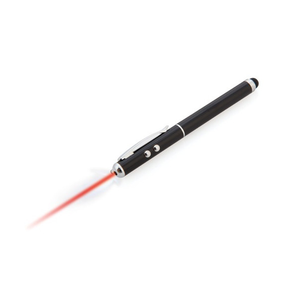 Elegante puntero láser de clase 1 acabado en aluminio brillante. Incorpora pulsadores de activación laterales, práctico clip de fijación, puntero táctil y cuerpo especialmente diseñado para marcaje en tampografía. Pilas de botón incluidas, y presentado en caja individual.