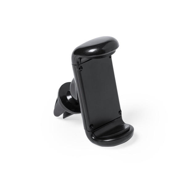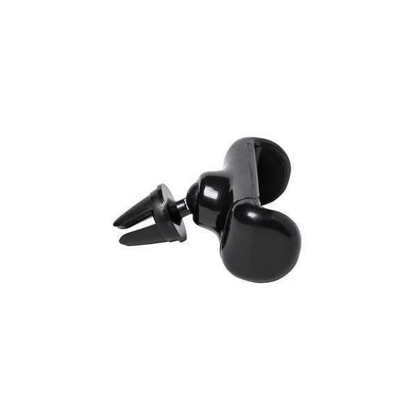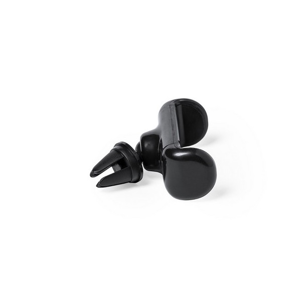 Soporte ajustable para smartphone de diseño minimalista, con base rotatoria 360º y de elegante acabado en color negro. Con sistema de fijación para rejilla de ventilación del automóvil y amplia superficie de marcaje, diseñado especialmente para tampografía.